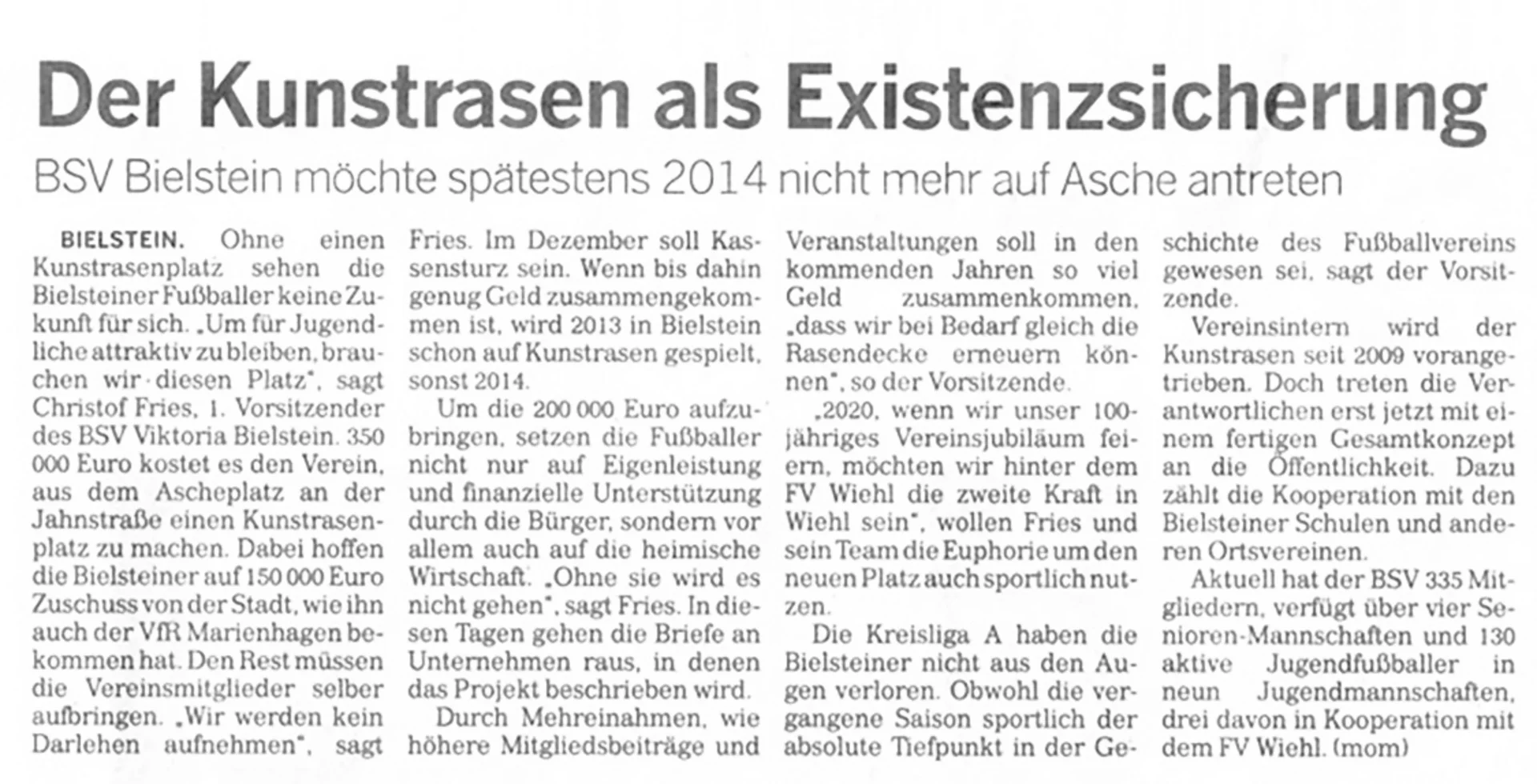 Der BSV Bielstein ist wieder einmal in der Presse vertreten: unter der Überschrift „Der Kunstrasen als Existenzsicherung” berichtet die Oberbergische Volkszeitung über das Kunstrasenprojekt unseres Vereins.
