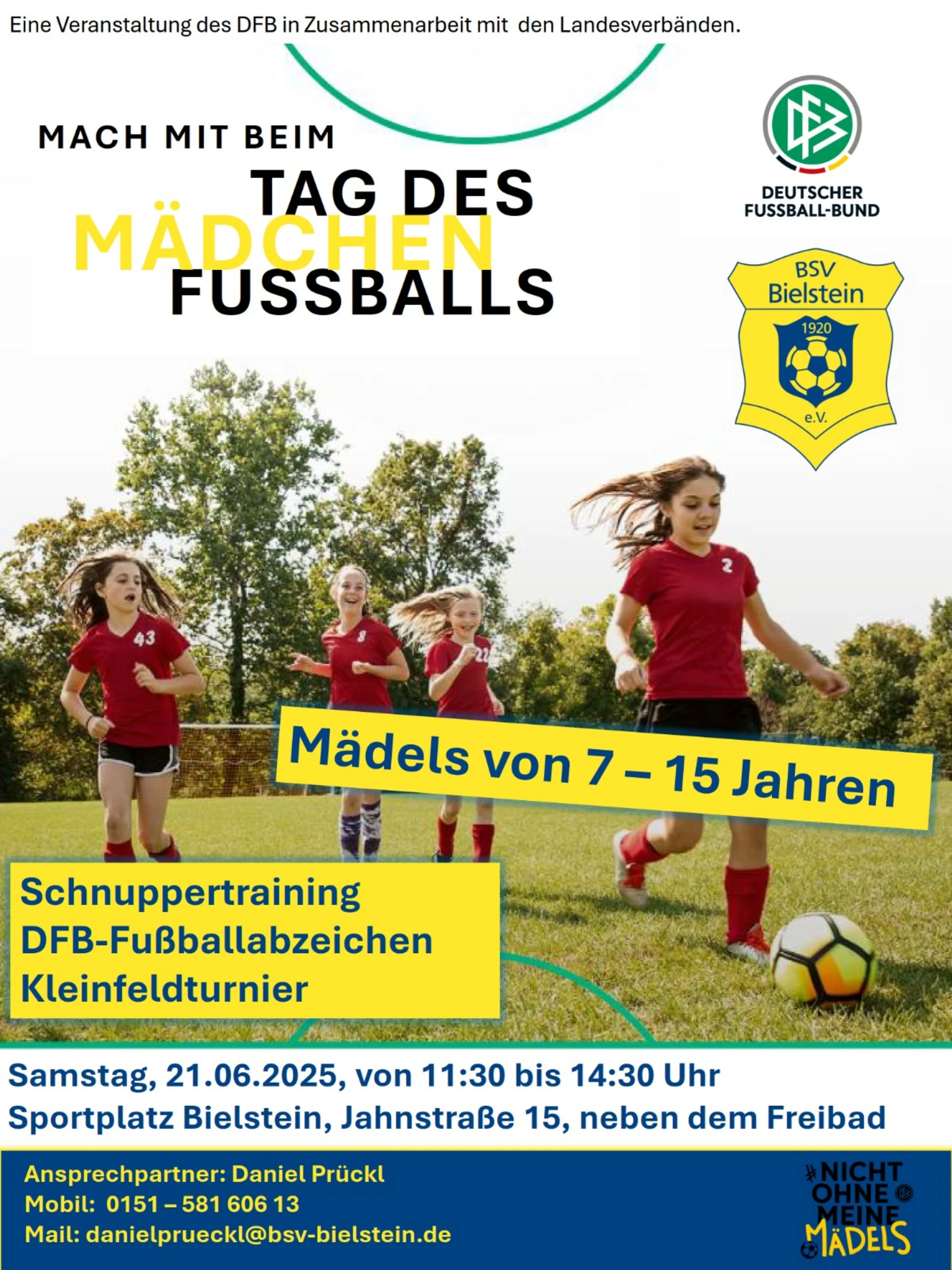 Am Samstag den 21.06.2025 findet von 11:30 bis 14:30 der Tag des Mädchenfußballs in Bielstein statt.